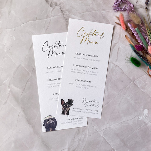 Couples are opting for personalised touches in their wedding stationery through custom illustrations. These illustrations can be the couple's wedding venue, the couple themselves or even adorable illustrations of the couple's pets, like our personalised pet menus and dessert bar signs. This bespoke approach adds a unique and sentimental element to the stationery suite and with more couples incorporating their pets into their wedding day, whether it's a welcome sign, place names or even having their dog as ring bearers, this trend is here to stay!